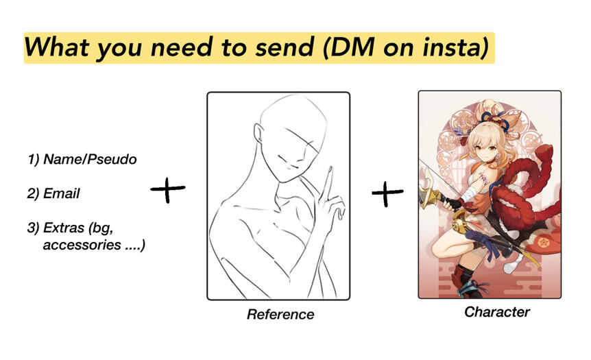 2. DM me on instagram asking for a commission: in your message, include your name/pseudo, an email and prepare a reference. Be as specific as you can as it will be way easier for me to do what you exactly want. If I’m not answering you, write a comment under my commission sheet, I might have missed your message ;)